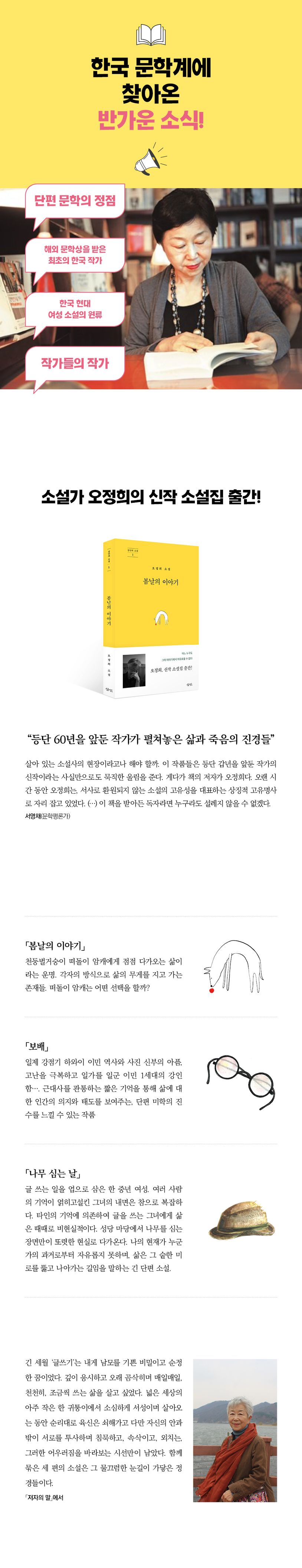 그랬던 작가 오정희가 실로 긴 침묵을 깨고 3편의 신작 소설을 묶은 창작집 『봄날의 이야기』로 오랜만에 인사를 전한다. 쓰지 않았거나 쓸 수 없었던 긴 시간 동안 농축된 진한 사색은 또 어떤 이야기로 형상화되었을까? 그의 이야기가 열어 보일 세계가 궁금하고 설렌다.