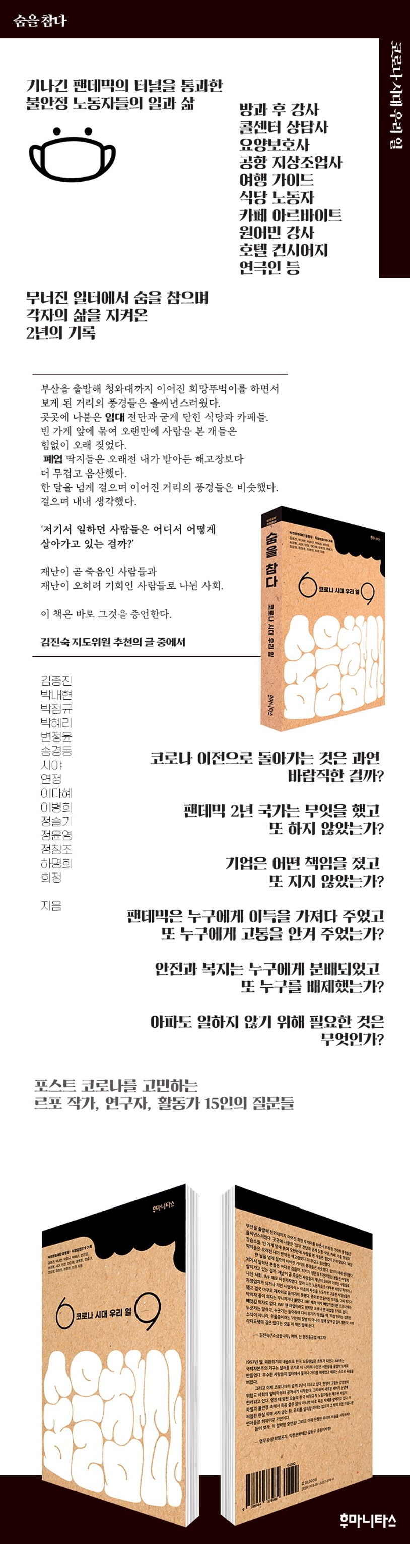 책의말미에는코로나시기고통이어떻게분배되었는지를보여주는통계들과코로나이전의한국노동시장의균열로문제의원인을거슬러올라가분석한연구자4인의글을같이실어양적?실증적분석을더했다.