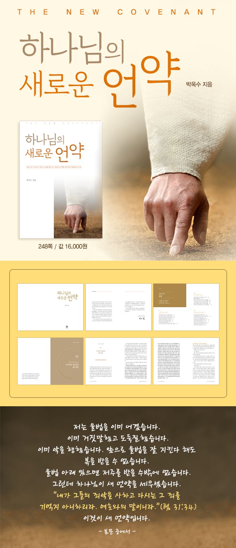 CLF에서 박옥수 목사가 목회자들에게 전한 말씀을 책으로 엮은 〈하나님의 새로운 언약〉은 아홉 개 장으로 구성되어 있으며, ‘신앙의 출발, 회개’, ‘하나님의 세계로 들어가는, 믿음’, ‘성도의 마음에 담겨 있어야 하는, 은혜’ 등 세 가지 주제를 중심으로 신앙의 에센스들을 담고 있다. ‘죄와 사망의 법’인 율법을 좇아 신앙생활을 하는 것이 아니라, 율법에서 벗어나 ‘생명의 성령의 법’에 이끌리는 참된 신앙의 길로 인도해 주는 〈하나님의 새로운 언약〉은 목회자들이 반드시 읽어야 할 책이며, 일반 성도들에게도 하나님의 깊은 은혜와 사랑을 만날 수 있는 특별한 영의 양식이 될 것이다.
