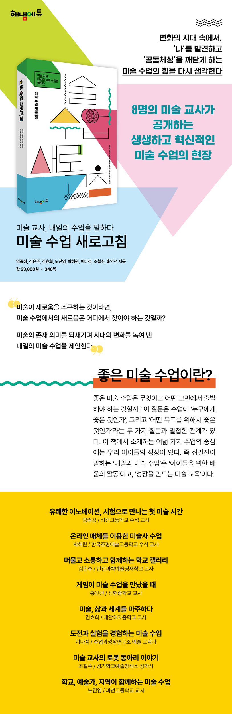 교사의 존재론적 본질은 가르침의 탁월성이 아니라 배움의 진정성과 지속성에 있다고 한다. 그래서 교사는 가르치는 사람이 아니라 배우는 사람이라고 말하기도 한다. 이 책은 ‘내일의 미술 수업’을 준비하는 선생님에게 새로운 수업의 이정표가 되어 줄 수 있을 것이다.