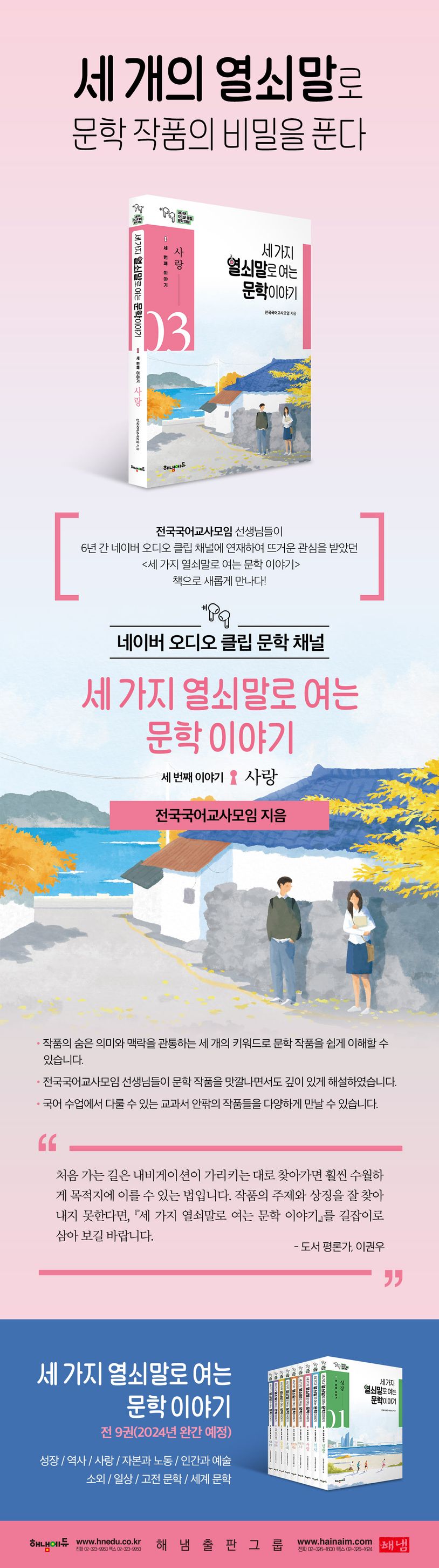 지난 1월부터 ㈜해냄에듀에서 꾸준히 출간하고 있는 『세 가지 열쇠말로 여는 문학 이야기』 시리즈의 “세 번째 이야기_사랑”이 출간되었다. 특히 이번에 출간된 “세 번째 이야기_사랑”부터는 표지가 새롭게 리뉴얼되어 독자들을 찾아간다. 책의 성격을 한눈에 알아볼 수 있는 일러스트가 인상적이다.