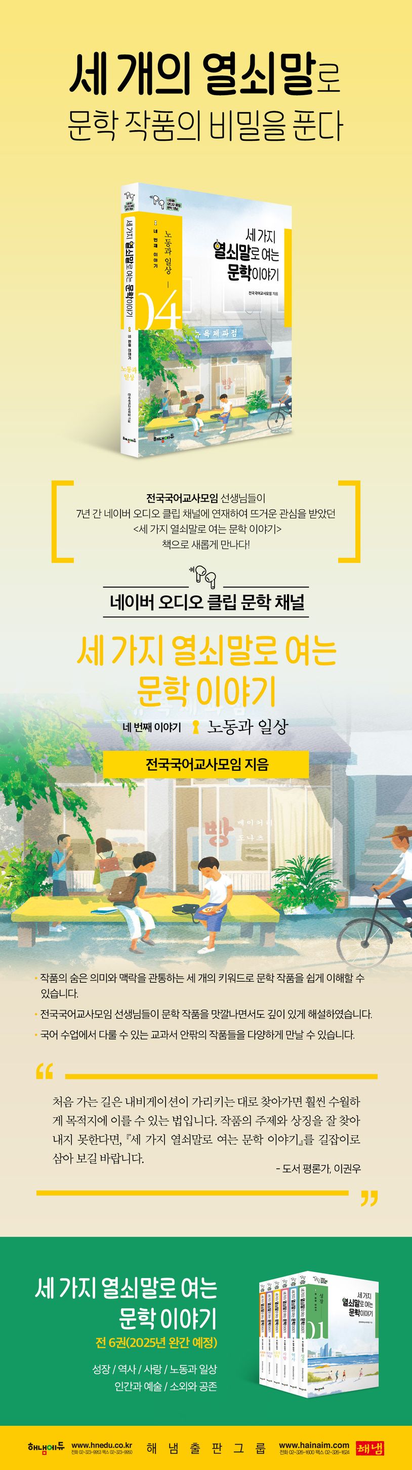 『세 가지 열쇠말로 여는 문학 이야기』 시리즈는 이번에 출간된 “네 번째 이야기_노동과 일상”을 비롯해 “첫 번째 이야기_성장”과 “두 번째 이야기_역사”, 그리고 “세 번째 이야기_사랑”이 이미 출간된 바 있다. 이후에도 “인간과 예술”, “소외와 공존”의 주제로 출간될 예정이다.