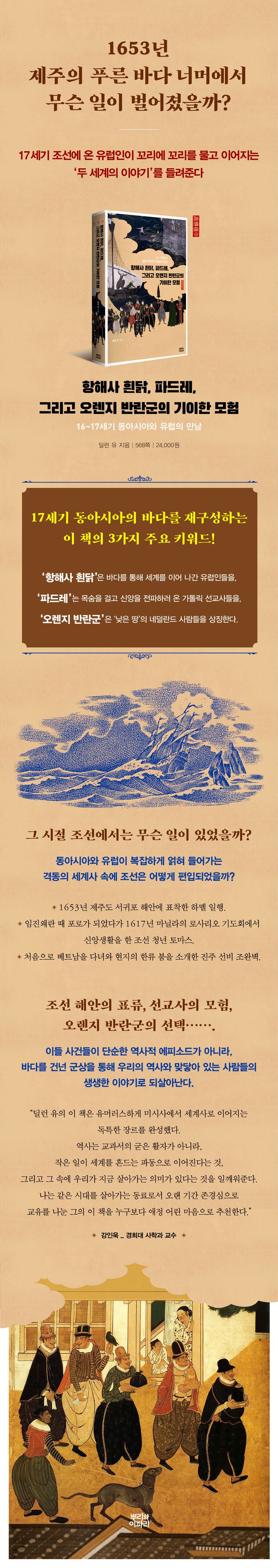 이 책은 370여 년 전 조선의 해안에 불시착하여 17세기 전 지구적 소빙기의 혹독한 겨울을 넘기기 위해 이야기를 들려주고 밥을 얻어먹었다던 사람들, 그 사람들처럼 넓은 바다를 건너 지구의 이쪽저쪽을 왔다갔다하면서 자신과 다른 사람들을 만나고 때로는 싸우고 때로는 인연을 맺었던 바로 그런 사람들에 대한 이야기다. 1657년 겨울, 춥디추웠던 전남 강진에서 이야기를 들려주며 그 계절을 나려고 했던 하멜 일행은 이러한 지각 변동의 파도에 휩쓸린 사람들 가운데 하나다. 하멜 일행의 이야기로 먼저 서두를 여는 것은 이들의 표착이 일어나기까지 대단히 많은 사람들의 이야기가 먼저 얽혀 있고, 이들의 조선 탈출 이후에도 여전히 대단히 많은 사람들이 이 무대에서 다른 이야기들을 이어 나가고 있기 때문이다. 우리가 아는 근대에 한 발자국 더 다가가는 시대가 열리기까지 풍운과 격랑의 바다가 펼쳐졌다.