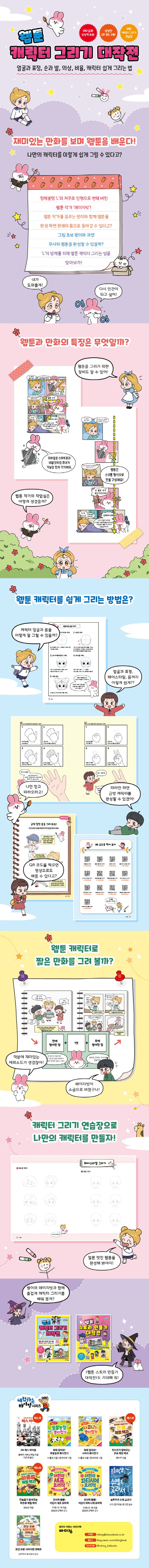 캐릭터의 얼굴과 팔다리뿐 아니라 웹툰 속 캐릭터의 성격을 살리는 표정과 의상 그리는 법까지 쉽게 알 수 있어요. ‘원이의 노트’로 캐릭터 그리기의 팁을 배우고, ‘캐릭터 그리기 연습장’에 따라 그려 보세요. QR 코드를 찍어 그리기 영상까지 보다 보면 어느새 나만의 캐릭터가 탄생할 거예요!