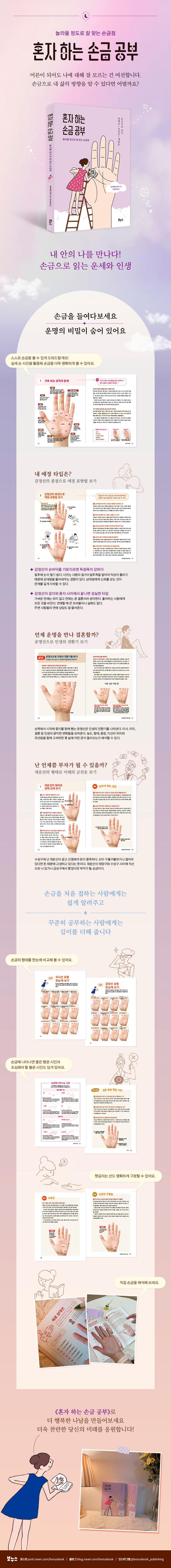 난 어떤 사람일까? 숨겨진 나의 성향과 기질은 무엇일까? 내 운명과 타고난 복은 무엇일까? 손금은 현재부터 가까운 미래, 먼 미래까지 어떤 일이 일어날지, 무엇을 조심해야 할지 알려줍니다. 놀라울 정도로 잘 맞는 손금점으로 내 안의 나를 만나보세요! 일, 사람 관계, 직장, 돈 문제로 고민하거나 결혼, 사업 등 큰 결정을 앞둔 분들에게 마음의 안식을 찾아줄 거예요.