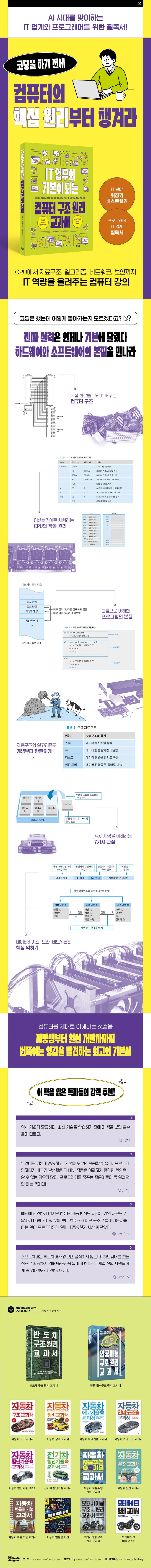 코딩 너머 ‘컴퓨터가 작동하는 진짜 모습’을 이해하는 데 주력한 컴퓨터 구조 해설서다. AI 시대에도 살아남을 탄탄한 실력과 응용력을 함양하려면 ‘컴퓨터는 어떻게 작동하는가’라는 질문에 답할 줄 알아야 한다. 하드웨어와 소프트웨어, 어셈블리어, 자료구조, 데이터베이스, 네트워크, 보안 등 컴퓨터의 핵심 기술들을 풍부한 그림과 예제로 설명한다. 특히 ‘입력-연산-출력’이라는 컴퓨터의 3대 원칙을 중심에 두고 내용을 전개하는 것이 특징이다. 하드웨어와 소프트웨어의 지식이 서로 연결되는 지점을 깨닫게 하는 책으로 프로그래머 지망생이나 신입 프로그래머, IT 종사자 등 컴퓨터 기술을 기초부터 다지고 싶은 독자에게 알맞다.