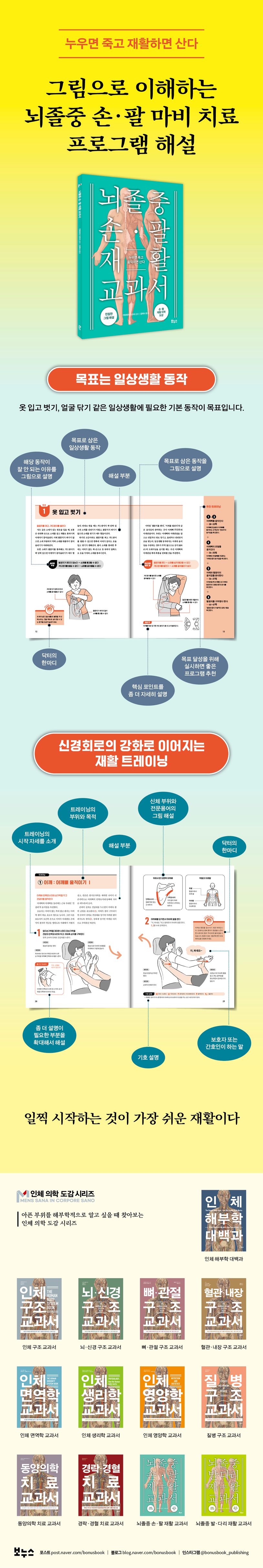 뇌졸중으로 인해 마비를 방치하면 어쩌면 남은 평생 누군가의 도움을 받으며 살아가야 할지도 모른다. 우리 몸의 신경은 그대로 두면 자연스레 굳거나 퇴화하기 때문이다. 뇌졸중으로 인한 마비가 어디까지 회복될지는 뇌의 손상 부위와 크기, 뇌 손상에 따른 마비와 감각장애, 고차원적인 뇌 기능 장애의 정도, 지금까지 받은 재활 치료의 내용과 발병 후 기간 등에 따라 다른데, 이 책은 뇌졸중 발병 후 생긴 편마비(한쪽마비)의 완화를 촉진해주는 치료법을 제시한다. 마비된 손 팔의 근육 경직을 예방하고, 환자가 조금이라도 더 편하게 생활할 수 있도록 활동 범위를 넓혀가는 것이 목표다.