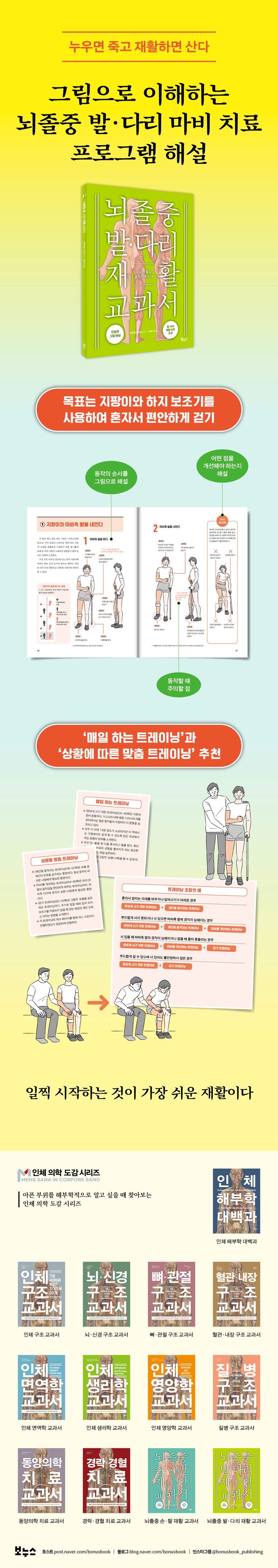 목표는안전하고실용적인보행속도동작이잘안되는이유를설명하고목표동작요령을그림으로해설뇌졸중은부분적으로든전체적으로든뇌기능에급속한장애가생기는뇌혈관질환으로,뇌혈관이막혔을때발생하는뇌경색또는허혈성뇌혈관질환이있고,뇌혈관이터졌을때발생하는뇌출혈또는출혈성뇌혈관질환이있다.일단뇌혈관에문제가생기면시야가흐릿해지거나머리가아프고어지러워균형감각에이상이나타난다.또한얼굴감각이상에사지위약감까지보여보행장애가생기기도한다.뇌졸중으로인해편마비(한쪽마비)가오면한쪽팔다리의근력이약해지거나경직이발생해발병전처럼자연스러운보행이어려워진다.그렇다고보행을포기할수는없다.편마비가왔을때정상보행을목표로무리하지말고,마비의정도에맞춰안정적이고편안한보행을지향하는것이중요하다.‘뭐이정도는할수있을거야.’라면서억지로걸으려고하다간넘어져서마비측(환측)넙다리뼈목부위혹은위팔뼈가골절되거나머리부위가충격을받아뇌손상을입을수도있다.그러므로트레이닝을시작하기전에는책에서소개한대로몸의어느부분을사용해보행할지와지팡이를사용하는위치까지상세하게알아둘필요가있다.이책에서는‘지팡이와하지보조기를사용하여혼자서편안하게걷기’를목표로‘편하게서기위한트레이닝’,‘체간을움직이는트레이닝’,‘마비를개선하는트레이닝’,‘걷기트레이닝’등을소개한다.각재활의목표동작과트레이닝순서를상세하게설명하므로‘혼자서편안하게걷기’라는목표를효과적으로달성하는데큰도움이될것이다.