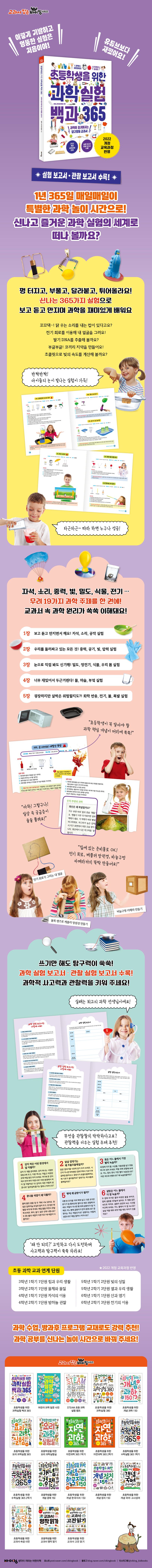 펑! 터지고 부풀고 달라붙고 튀어올라요! 우리 아이들의 호기심을 꽉 채워 줄 《초등학생을 위한 과학실험 백과 365》가 나왔어요. 이 책 한 권이면 1년 365일, 매일매일이 특별한 과학 놀이 시간으로! 놀이처럼 즐거운 과학 실험 하나하나가 우리 아이 안에 잠자던 꼬마 과학자를 깨워 줄 거예요!