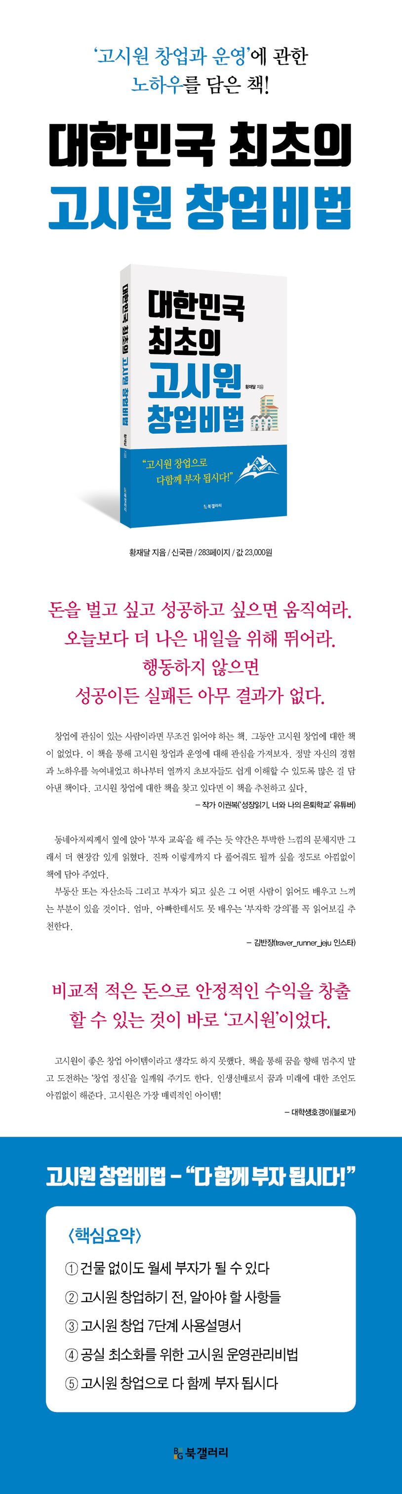 새로운 창업 아이템으로 떠오르고 있는 ‘고시원 창업과 운영’에 관한 노하우를 담은 책. 건물 없이도 월세 부자가 될 수 있다는 강점을 비롯하여 고시원을 창업하기 전, 알아야 할 사항들과 고시원 창업 7단계 사용설명서, 공실 최소화를 위한 고시원 운영관리비법 등을 실증(實證) 사례와 함께 상세하게 소개한 이 책은 좋은 고시원을 선택하는 노하우 8가지와 가격 대비 높은 만족도의 가성비를 얻을 수 있는 방법까지도 자세하게 정리했다.