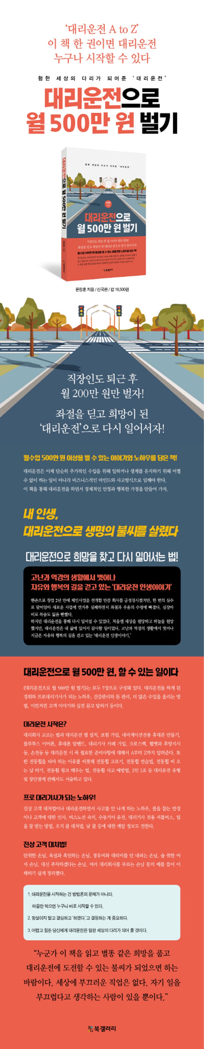 대리운전을 시작하거나 현재하고 있지만 미흡한 이들을 위한 실전 가이드북. 대리운전으로 희망을 찾고 다시 일어서는 법을 정리한 《대리운전으로 월 500만 원 벌기》는 대리운전 경험과 실수담, 에피소드 그리고 수입을 올리는 노하우 등을 종합적으로 담은 책으로, 이 책 한 권이면 누구나 대리운전을 쉽게 시작할 수 있다.