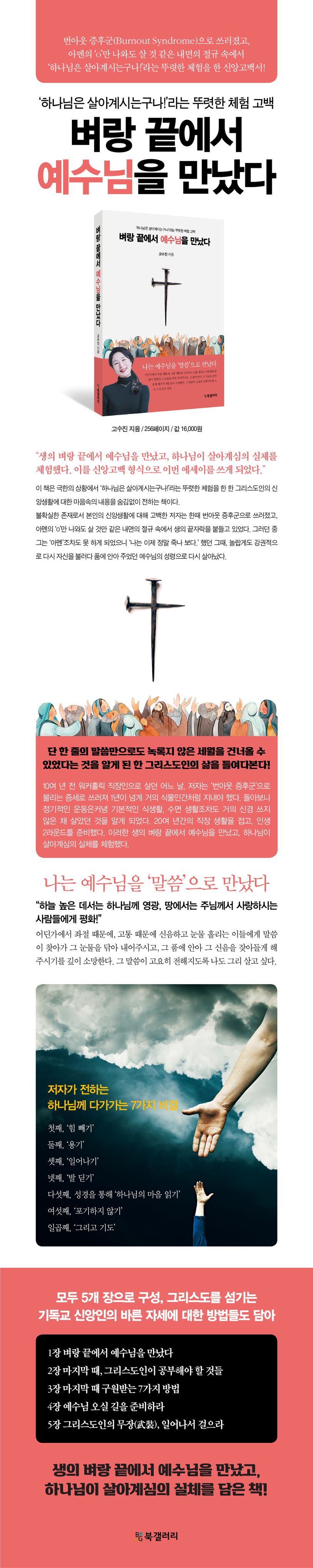 하나님의 존재를 실제로 체험한 신앙고백서. 《벼랑 끝에서 예수님을 만났다》는 극한의 상황에서 ‘하나님은 살아계시는구나!’라는 뚜렷한 체험을 한 한 그리스도인의 신앙생활에 대한 마음속의 내용을 숨김없이 전하는 책이다.