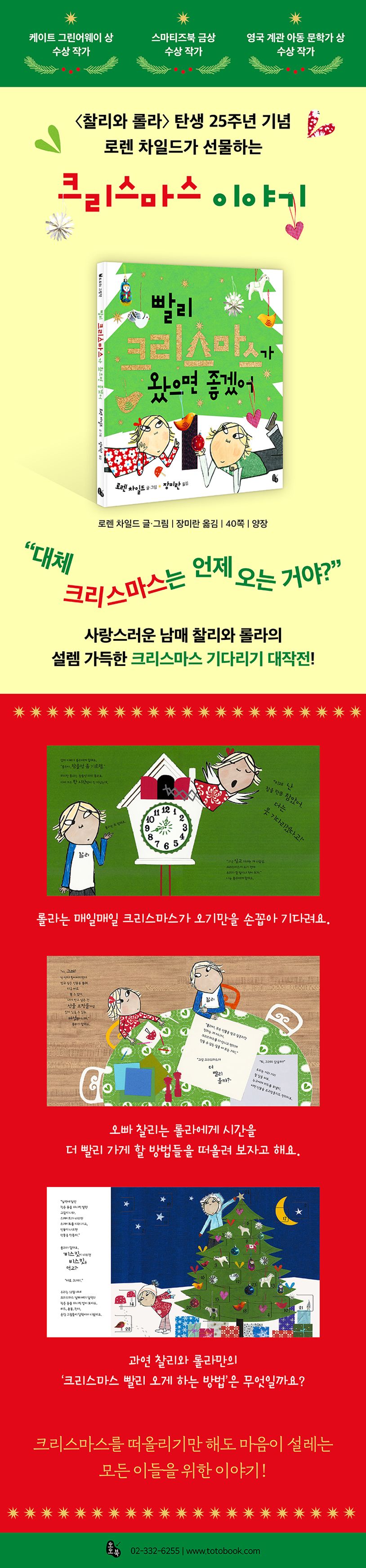 매 순간 크리스마스를 기다리며 ‘어떻게 하면 조금이라도 더 빨리 크리스마스가 올까?’ 안달하는 어린이의 모습을 발랄하게 담아낸 그림책 《빨리 크리스마스가 왔으면 좋겠어》가 토토북에서 출간되었습니다. 세계적으로 사랑받는 작가 로렌 차일드가 〈찰리와 롤라〉 시리즈의 탄생 25주년을 기념하여 독자들에게 전하는 특별한 선물이지요. 사랑스러운 남매 찰리와 롤라의 설렘 가득하고 즐거운 ‘크리스마스 기다리기 대작전’에 독자 여러분을 초대합니다.