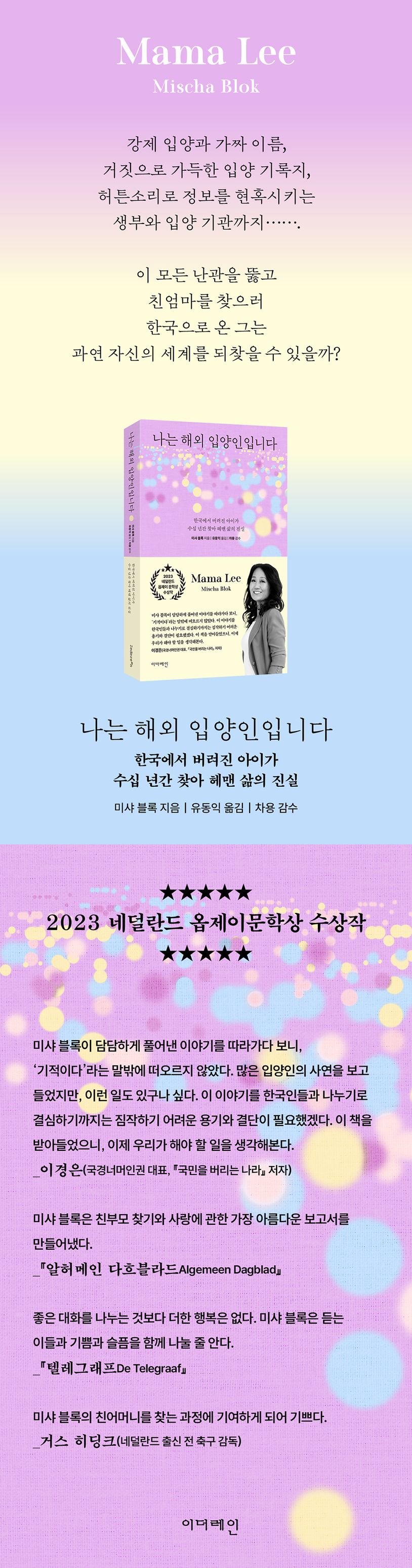 한국에서 태어나 네덜란드로 입양된 저자가 자신의 결핍과 근원을 찾기로 결심하고 네덜란드와 한국을 오간다. 간절한 그를 기다렸던 건 입양기관의 날조된 기록과 생부의 회피였다. 수많은 어려움 끝에 결국 진실을 손에 쥐는 그의 이야기는 해외 입양의 추악한 현실과, 그 과정에서 생겨난 한 사람의 깊은 고통, 그리고 개인의 성장과 치유 과정까지 고스란히 보여준다.