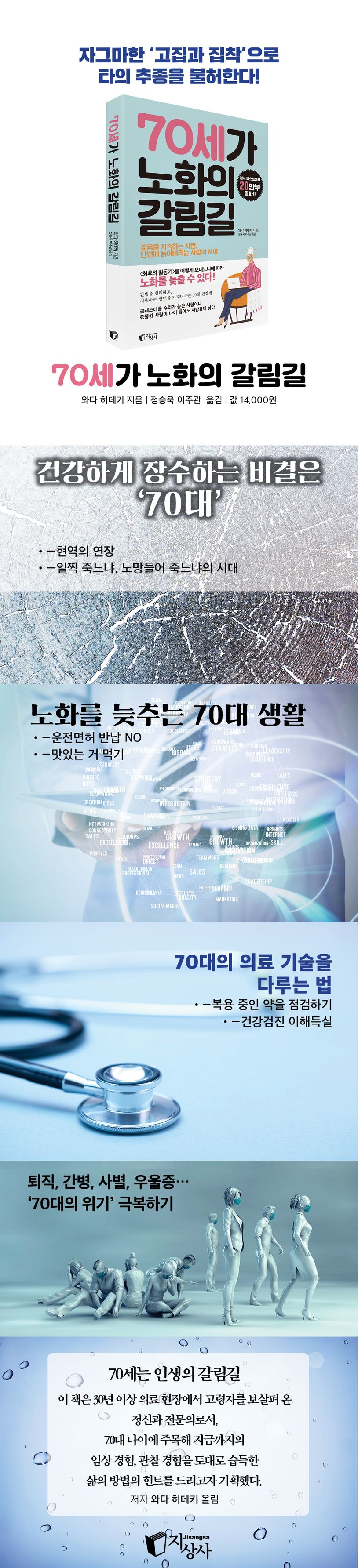 혈압이나 혈당치도 비교적 높을수록 머리가 맑아진다. 이 때문에 약을 복용해 인위적으로 낮추면 머리가 멍해진다. 또한 고혈압이나 고혈당인 사람은 염분 제한이나 식단 제한을 하기 마련이다. 그러면 삶의 즐거움은 사라지고 자극적이지 않은 음식을 섭취하면서 기운 없는 노인이 되기 십상이다. 아직 대규모 조사가 거의 이루어지지 않았기 때문에 장수할 수 있도록 해준다는 의료 기술을 진짜로 신뢰할만한 것인지 알 수 없다. 실제로 콜레스테롤 수치가 높은 사람이나 뚱뚱한 사람이 나이 들어도 사망률이 낮다는 것이 점차 밝혀지고 있다. 고령자임에도 체념하지 않고, 구시대적 의료 상식에 얽매이지 않으면서, 70대를 어떻게 살아가느냐에 따라 남은 삶이 크게 달라진다는 것을 저자는 30년 이상의 임상 경험에서 절감하고 있다. 이 점을 믿고 이것저것 시도할 생각이 있다면, (그것만으로도 아직 젊다는 증거) 앞으로 인생의 힌트로 삼는다면, 저자로서 더할 나위 없을 것이다.