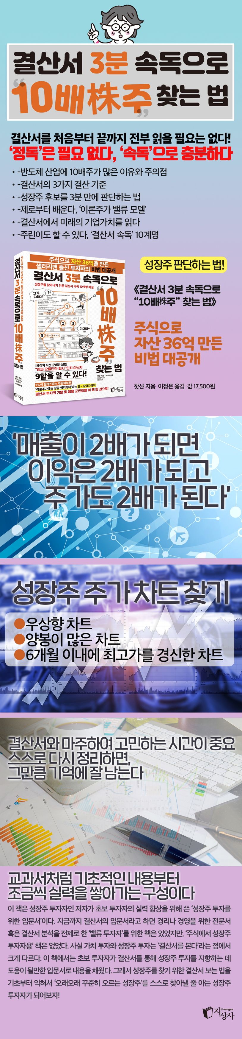 이러한 두 종류 주식의 차이도 실적에 있다. 실적호조가 일시적인 현상으로 끝나는 ‘단기로 끝나는 주식’과 실적호조가 5년, 10년간 지속하는 ‘장기로 오르는 성장주’다. 전문 기관 투자자나 중상급 이상의 개인투자자는 대개 실적을 보고 주식을 매수한다. 여기서 말하는 실적이 바로 결산서다. 이 책은 성장주 투자자인 저자가 초보 투자자의 실력 향상을 위해 쓴 ‘성장주 투자를 위한 입문서’다.