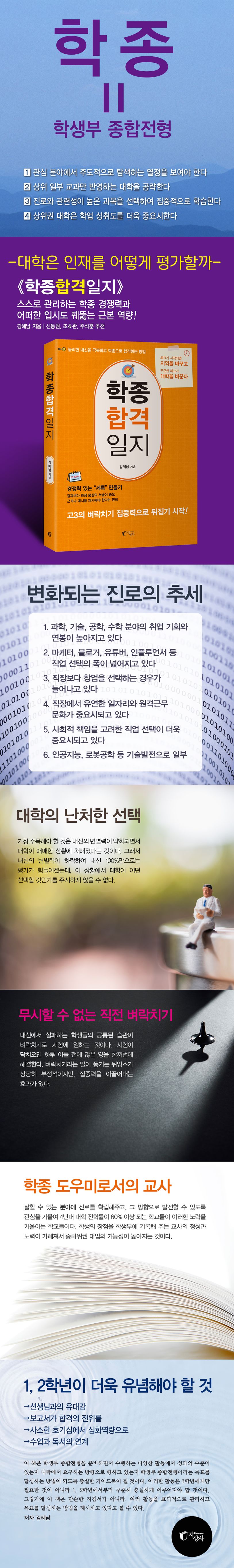 학생의 잠재 능력개발을 위해서 다양한 프로그램을 개발하고 충실한 활동이 필수적이다. 이러한 활동을 하면서 학종은 치밀한 관리가 필요한데, 대부분 학생은 어떻게 준비하고 관리할지 가늠하기 쉽지 않은 상황이다. 일선 학교의 입장에서도 모든 학생을 효율적으로 관리하여 목표를 성취하게 하기가 쉽지 않다. 그렇기에 학종 준비가 잘 되고 있는지 스스로 체크하고 관리하는 노력이 필요하고 이러한 활동을 확인할 수 있는 워크북 겸 책에 대한 수요가 요구되는 것도 사실이다. 1, 2학년 학생은 1년 내내, 3학년은 2월부터 수능 전인 11월까지 자신의 활동을 체크하면서 활동상황을 관리할 수 있는 지침서가 필요한 이유가 바로 여기에서 파생된다. 이 책은 학생부 종합전형을 준비하면서 수행하는 다양한 활동이 수준에 있는지 대학에서 요구하는 방향으로 향하고 있는지 학생부 종합전형이라는 목표를 달성하는 방법이 되도록 충실한 안내서가 될 것이다.