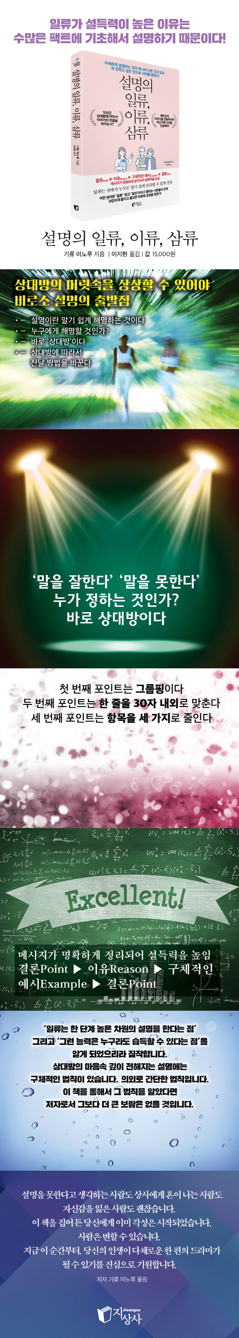 이런 수준의 설명이 아니다. 그들은 이를 훨씬 뛰어넘는 최고 수준의 설명 방법을 알고 있고 더 좋은 방법을 위해서 끊임없이 연구한다. 이 책은 그런 설명의 일류가 실천하고 있는 모든 설명의 방법을 수록했다. 그리고 ‘삼류는 이렇게 한다, 이류는 이렇게 한다, 그렇다면 일류는 어떻게 할까?’의 순서로 집필했다. 또한 누구라도 간단하게 일류의 설명하는 방법을 익힐 수 있도록 구체적인 답을 준비했다. 분명히 당신도 즐겁고 재미있게 그 방법을 익힐 수 있을 것이다. ‘설명하는 힘(說明力)’을 기르면 당신의 커뮤니케이션 능력은 눈에 띄게 좋아질 것이다.