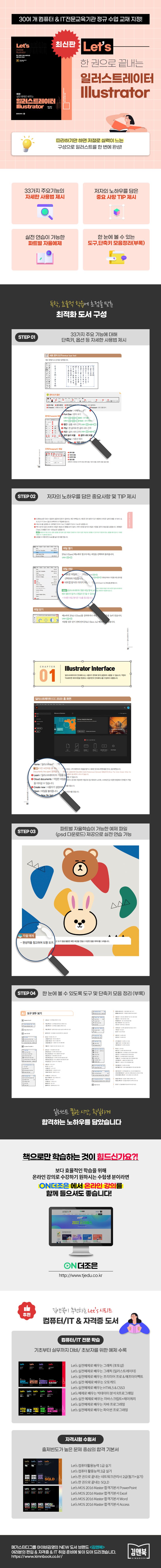 PART01.일러스트레이터시작하기chapter01IllustratorInterfacechapter02파일관리하기chapter03패스와오브젝트의이해chapter04선택도구chapter05대지PART02.도형chapter01모양도구chapter02선도구PART03.채색chapter01색상적용chapter02그레이디언트PART04.배열과정렬chapter01배열chapter02정렬PART05.변형chapter01변형PART06.드로잉chapter01정확하게패스그리기chapter02자유롭게패스그리기PART07.Pathfinderchapter01패스파인더PART08.패턴chapter01패턴PART09.스타일화,왜곡과변형효과chapter01스타일화효과chapter02왜곡과변형효과PART10.문자chapter01문자도구PART11.Blendchapter01블렌드도구PART12.Brushchapter01브러시chapter02브러시만들기PART13.Symbolchapter01심볼chapter02심볼만들기PART14.마스크chapter01클리핑마스크chapter02불투명마스크chapter03격리모드PART15.라이브페인트chapter01라이브페인트PART16.이미지추적chapter01이미지추적PART17.혼합모드chapter01혼합모드chapter02아트웍색상변경PART18.EnvelopeDistortchapter01둘러싸기왜곡PART19.GradientMeshchapter01그레이디언트메쉬PART20.입체효과chapter013D입체효과부록도구모두보기일러스트레이터단축키모음