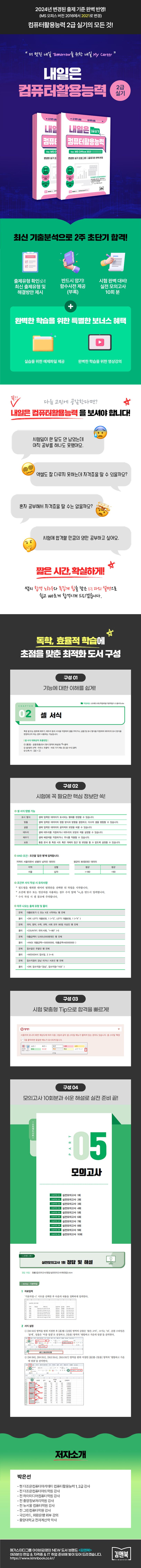 「내일은 컴퓨터활용능력 2급 실기」는 자격증을 준비하는 수험생 & 재직자를 위해 쓰였습니다. 이 책은 저자의 합격 노하우와 족집게 팁을 담은 1:1 과외 설명으로 쉽고 빠르게 합격할 수 있도록 구성하였습니다.