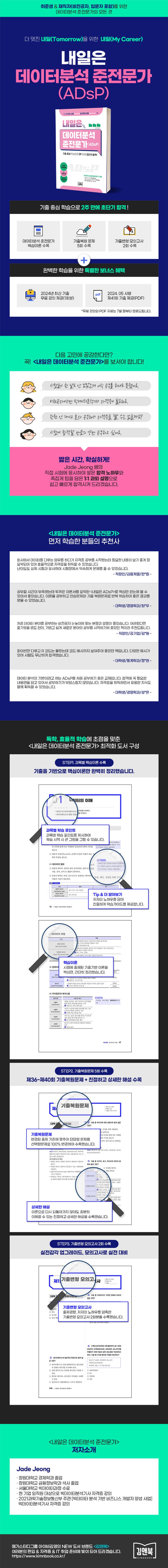 〈내일은 데이터분석 준전문가(ADsP)〉는 자격증을 준비하는 수험생과 재직자(비전공자, 입문자 포함)를 위해 만든 교재입니다. 이 책은 저자가 직접 시험에 응시하여 쌓은 합격 노하우를 바탕으로, 최신 5개년 기출문제를 분석하여 비전공자도 2주만에 합격할 수 있도록 구성하였습니다. 최신 변경된 출제기준을 반영하여 단답형 문제를 선택형 문제로 변형하여 수록했습니다.