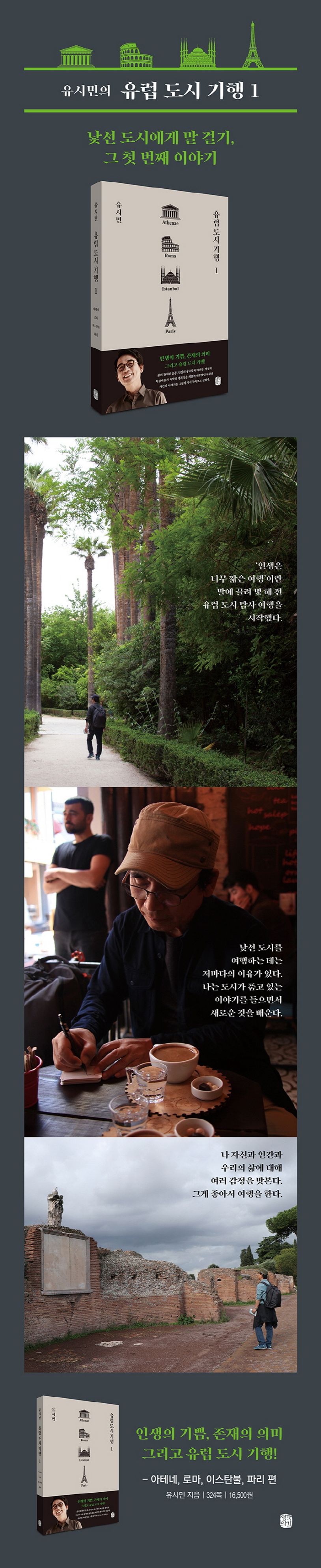 도시가 품고 있는 이야기를 들으면서 새로운 것을 배우는 유시민. 5년이라는 시간 동안 아내 한경혜와 함께 수첩과 카메라를 들고 유럽의 도시를 탐사한 그가 도시의 건축물과 거리, 광장, 박물관과 예술품이 들려주는 이야기에 귀 기울일 수 있도록 역사와 문화, 그리고 그에 얽힌 지식과 정보를 자신만의 목소리로 담아낸 『유럽 도시 기행』 제1권 《아테네, 로마, 이스탄불, 파리 편》.
