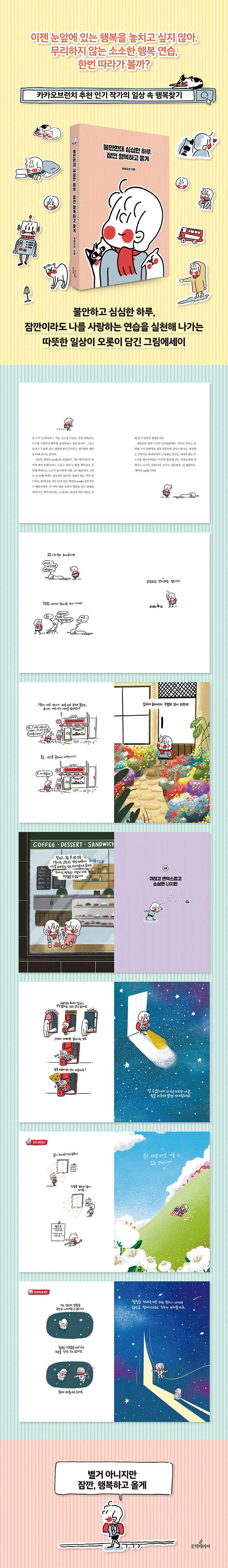 『불안한데 심심한 하루, 잠깐 행복하고 올게』는 누구나 혼자 속으로 감추고 있는 부끄러운 고민과 서툰 실수가 가득한 하루를 담아내면서 독자들에게 재미와 공감을 불러일으키는 동시에 함께 좀 더 나은 오늘을 보내자고 손 내미는 책이다. 그리고 어느샌가 나도 모르게 웃음 지으며 마주할 수 있을 것이다. 보이지 않는다고 덮어 두었던, 눈앞의 잔잔한 행복의 가치를.