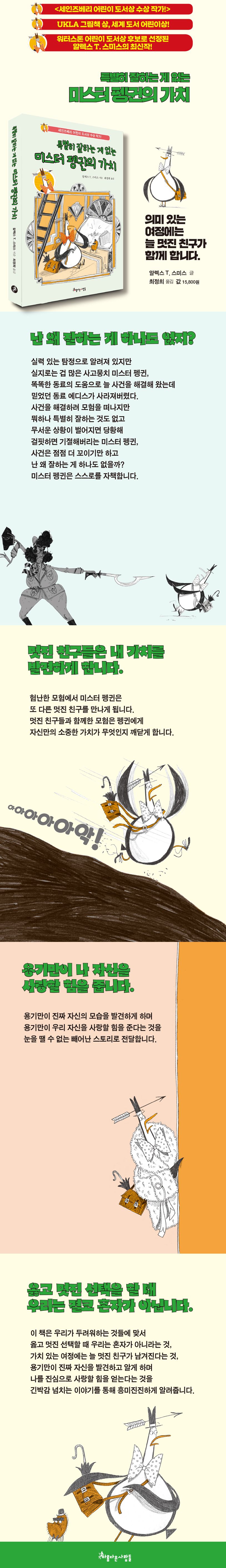 미스터 펭귄은 자신이 겁 많고 특별히 잘하는 게 하나 없어 자신을 늘 쓸모없는 존재처럼 여깁니다. 그러나 그는 멋진 친구들과 함께한 모험을 통해 자신에게는 누구보다 친구를 위하고 믿으며 정의롭지 못한 일들에 맞서려는 마음이 있다는 것을 압니다. 그런 마음은 그 무엇보다 소중한 자신만의 가치이며 그것이 결국 자신에게 포기하지 않는 용기를 준다는 것을 깨닫습니다. 이제 미스터 펭귄은 자신감에 차서 가슴을 쭉 내밀고 당당하게 자신을 사랑할 힘을 얻습니다.