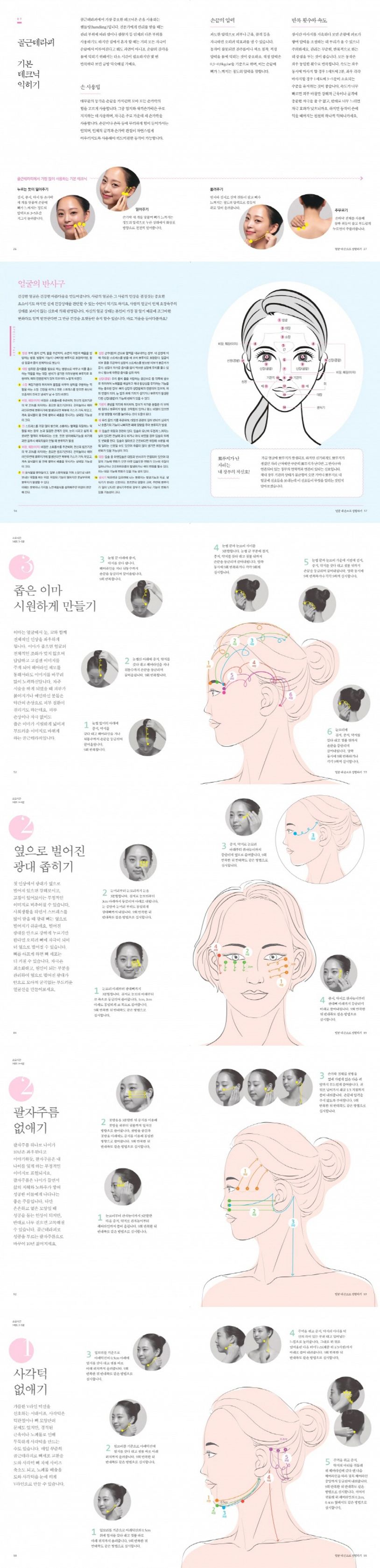 《얼굴 내 손으로 성형하기》는 골근테라피의 이론적 배경에 대한 설명, 작용 원리, 간단한 준비 방법이 나와 있고 마사지 강도나 자세한 동작을 설명해줌으로써 전문가가 아니어도 직접 하는 데 지장이 없다. 얼굴에서 예뻐지고 싶은 부위를 아프지 않게 관리하며 요요 현상이 생기지 않도록 만든다는 게 장점이다. 물론 정확한 동작을 배우려면 시간이 걸리고 실천해야 효과를 볼 수 있지만 무엇보다 과학적으로 임상을 거쳐 만든 확실한 방법이기 때문에 열심히 따라한다면 확실한 효과를 볼 수 있다.