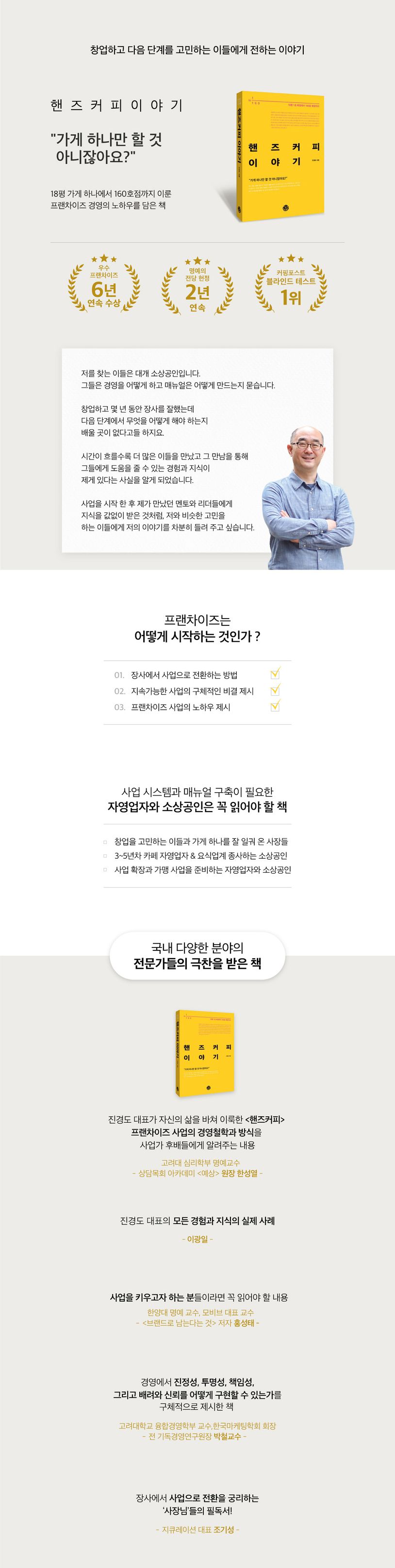 〈핸즈커피 이야기〉를 읽는 독자들은 읽는 내내 컨설턴트나 강사가 아니라, 진심으로 하나의 가게부터 꾸려온 비즈니스 멘토로서 저자 진경도 대표의 진솔한 목소리를 듣는 기분이 들 것이다. 그만큼 〈핸즈커피 이야기〉는 진솔하고 또 진정성 있다.