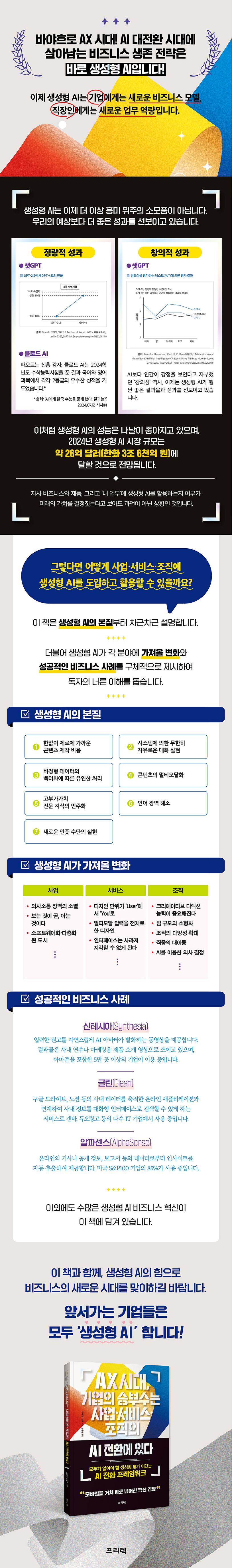 이 책은 각각 사업 개발, 서비스 개발, 조직 개발이라는 3가지 관점에서 생성형 AI가 현재 어떤 형태와 모습으로 나타나고 있으며 영향을 미치는지, 그리고 미래에는 어떤 모양새로 발전하게 될지 2개의 시간 축으로 소개합니다. 생성형 AI를 업무와 비즈니스에 활용하는 구체적인 기술과 성공적인 사례를 소개할 뿐만 아니라, 소매업과 SNS 서비스, 미디어와 엔터테인먼트, 교육 및 학습까지 다양한 업계의 AX 미래 예측까지 담고 있습니다.