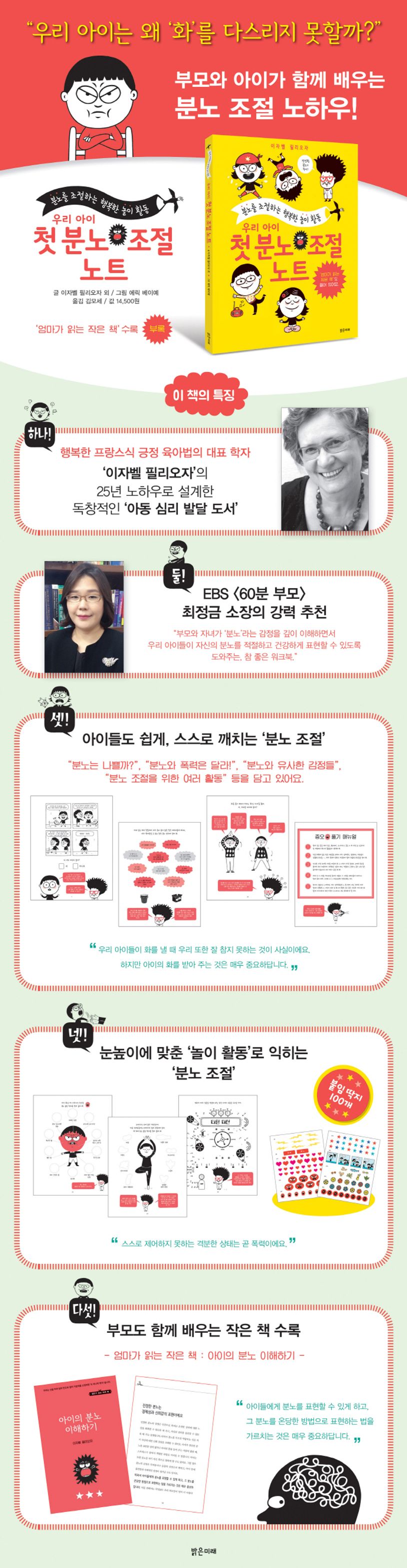 《우리 아이 첫 분노 조절 노트》는 아이들이 스스로 ‘놀이 활동’을 하면서 ‘분노’가 무엇인지 알게 하는 책이다. 뿐만 아니라 폭력과 분노는 무엇이 다르며, 분노를 조절하기 위해서 어떻게 해야 하며, 스트레스에 의한 증상이나 오랫동안 묵힌 증오는 무엇인지 차근차근 알 수 있게 구성되어 있다. 결과적으로 스스로 ‘분노 조절’을 할 수 있는 능력을 키우는 책이다. 아이들이 쓰고, 그리고, 선택하고, 색칠하고, 만들고, 활용하는 다채로운 활동을 통해 ‘분노’라는 추상적인 개념을 구체적으로 익힐 수 있을 뿐 아니라, ‘분노 조절’을 통해 폭력이 아닌 정체성과 신뢰감의 표현이 될 수 있는 건강한 분노 표출을 훈련합니다.