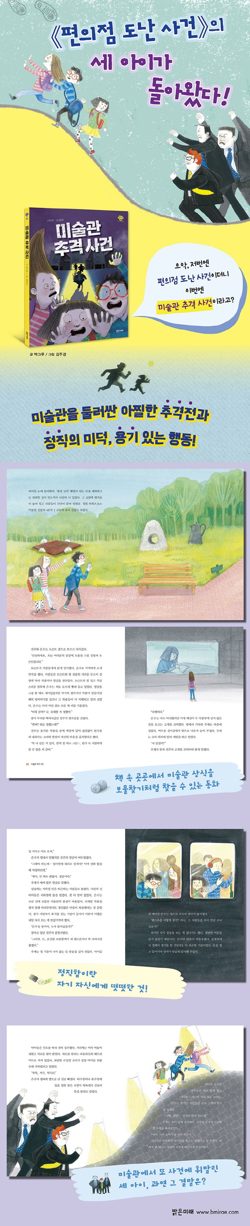 《편의점 도난 사건》에서 엄마의 누명을 벗기려고 범인을 추적하던 세 아이가 돌아왔다. 이번에 사건이 펼쳐지는 곳은 편의점이 아니라 미술관! 미술관이라는 이색적인 장소에서 은수, 우재, 진주 세 아이와 수상한 삼총사가 추격전을 벌이는 《미술관 추격 사건》은, 어린 세 친구가 용기를 내 지혜를 모으고 협동하는 과정을 아슬아슬 짜릿하고 속도감 있게 그려 냈다.