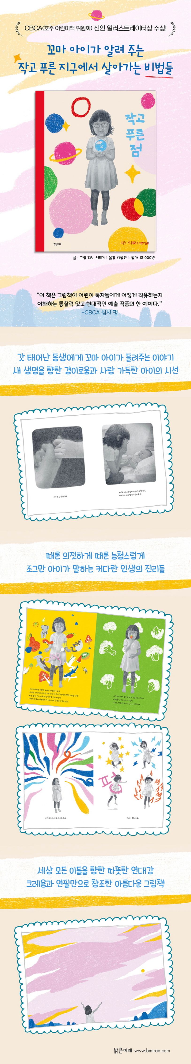 꼬마 아이가 갓 태어난 동생에게 조곤조곤 들려주는 이야기는 새 생명을 향한 경이로움과 사랑 가득한 아이의 시선을 한껏 품었다. 때론 의젓하고 때론 능청스럽게 조그만 아이의 입속에서 나오는 말들은 독자들의 웃음을 자아내면서도 의외로 커다란 인생의 진리들을 담고 있다. 무엇보다 이 책의 가장 큰 메시지는 우리 모두가 이 작고 푸른 점에 살고 있으며, 이 작고 푸른 점과 서로를 잘 돌보는 것은 우리 스스로에게 달려 있다는 것이다.