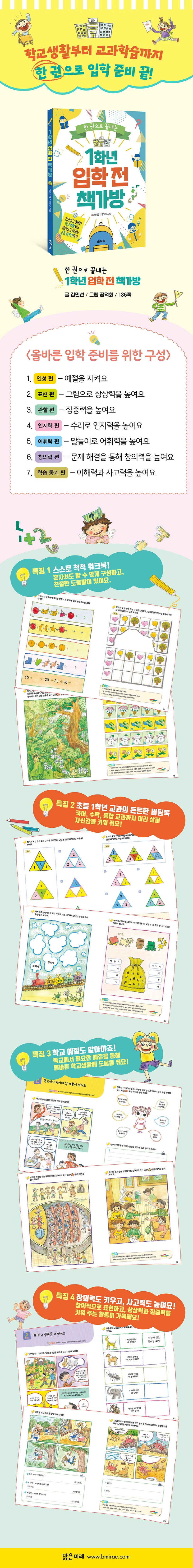 이 책에서는 1학년 교과학습을 예숩하는 데 초점을 맞추기보다, 학교생활을 더 잘 할 수 있도록 하는데 주력한다. 학교생활에서 가장 기본적인 예절부터 이야기한다. 물론 교과학습에 대한 기초적인 활동도 담고 있다. 기본적인 어휘력, 말놀이나 그림을 그리고, 숫자, 도형으로로 노는 수리적 활동까지 할 수 있다. 이러한 것을 통해 집중력, 사고력과 창의력, 학습 동기 등 기본적인 학습 태도를 만들어 간다. 이러한 활동은 1학년 교과를 기반으로 만들어졌기 때문에 아이들의 원활한 학교생활과 학습에 대한 흥미와 동기를 유발할 수 있을 것이다.