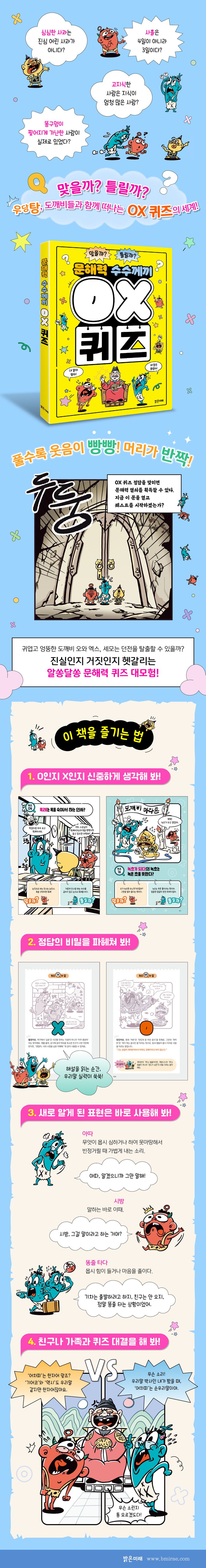 출발4퀴즈1출입엄금에서엄금은엄청난금?19퀴즈2심심한사과는진심어린사과가아니다?21퀴즈3입에침바른소리는겉만번지르르한말?23퀴즈4목례는목을숙여서하는인사?25퀴즈5고지식한사람은지식이엄청많은사람?27퀴즈6미덥다는믿음직스럽다는뜻?29퀴즈7숫기는부끄러워하는기운?31퀴즈8시장이반찬이다는시장에가면반찬이많다는뜻?33퀴즈9입이궁금하면먹을게필요하다?35퀴즈10금일은금요일의줄임말?37퀴즈11무궁화,해당화,수선화,수채화는모두꽃이름?39퀴즈12사흘은4일이아니라3일이다?41지식나와라뚝딱!때를나타내는순우리말43퀴즈13나이가지긋하면지긋지긋한사람?45퀴즈14부채가많은회사는위험하다?47퀴즈15모르는게상책은모르는개를산책시키라는뜻?49퀴즈16녹초가되다의녹초는녹은초를뜻한다?51퀴즈17불가사의는바다에사는별모양바다생물이다?53퀴즈18숙맥은콩과보리를뜻하는말이다?55퀴즈19십분이해하면,10분뒤에는까먹게된다?57퀴즈20목구멍이포도청에서포도청은포도를꿀에절인것?59퀴즈21중식제공은중국음식을제공한다는말?61퀴즈22멜빵은순우리말이다?63퀴즈23오지다는사투리가아니다65지식나와라뚝딱!사투리같은표준어67퀴즈24삶이무료한이유는태어날때돈을내지않기때문이다?69퀴즈25아수라장의아수라는귀신이름이다?71퀴즈26코빠진날은생일날을뜻한다?73퀴즈27이것은인재입니다인재는재주가많은사람?75퀴즈28시발점은욕이맞다?77퀴즈29어차피는한자로이루어진말이다?79퀴즈30참가인원미정은미정이가참가한다는뜻?81퀴즈31가로등은원래세로등이었다83퀴즈32오리무중은꽥꽥오리랑은상관없는말이다?85지식나와라뚝딱!사자성어가로세로낱말퍼즐87퀴즈33대관절은우리몸에있는가장큰관절?89퀴즈34바캉스는일본어에서온말이다?91퀴즈35부랴부랴는‘불이야불이야!’에서온말이다?93퀴즈36십팔번은18번이나부를정도로좋아하는노래?95퀴즈37시치미는매의꽁지에달던꼬리표?97퀴즈38오금이저리다의오금은다섯개의발가락?99퀴즈39추후공고는고등학교이름이다?101퀴즈40말짱도루묵의도루묵은물고기이름이다?103퀴즈41맙소사는‘마옵소서’에서비롯된말이다?105퀴즈42토끼는깡총깡총이아니라깡충깡충뛴다?107지식나와라뚝딱!틀리기쉬운맞춤법109퀴즈43눈꽃은시베리아에서자라는눈나무의꽃이다?111퀴즈44우천시실내로장소변경우천시는도시이름?113퀴즈45영감은조선시대벼슬아치였다?115퀴즈46수저는숟가락과같은말이다?117퀴즈47깜짝출연이라는뜻의카메오는카메라에서비롯된말이다?119퀴즈48그정도는약과에서약과는과자의한종류이다?121퀴즈49개차반은똥을뜻하는말이다?123퀴즈50안절부절못하다의반대말은안절부절하다?125퀴즈51명태,동태,황태,북어는모두같은생선이다?127퀴즈52똥구멍이찢어지게가난한사람이실제로있었다?129지식나와라뚝딱!공통으로들어가는단어131퀴즈53이부자리는전갈자리옆에있는별자리?133퀴즈54칠칠한사람은깔끔한사람을뜻한다?135퀴즈55수도꼭지는잠궈야하는게아니라잠가야한다?137퀴즈56책을사서선생님께반납하려면책사러서점으로가야한다?139퀴즈57곰탕은곰고기를끓인국이아니다?141퀴즈58알쏭달쏭은헷갈리다는뜻의프랑스어?143퀴즈59미주알과고주알은달걀이다?145퀴즈60혀가짧다와입이짧다는같은뜻?147지식나와라뚝딱!도전문해력왕!149도착150