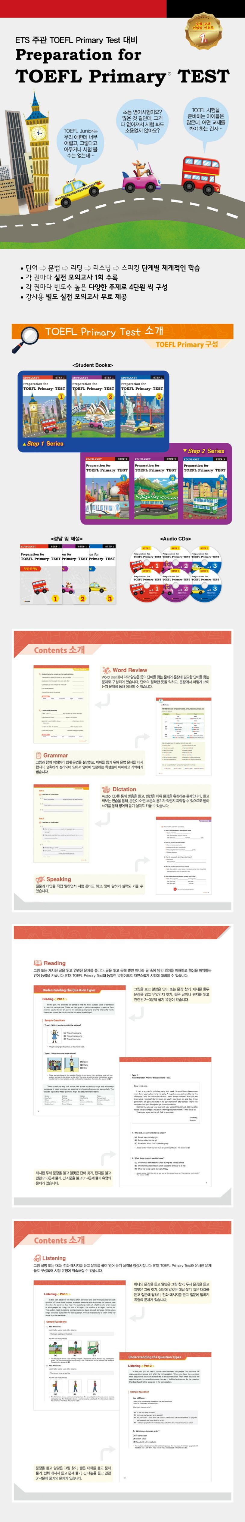 『Preparation for TOEFL Primary Test Book. 2』는 ETS 주관의 TOEFL Primary Test를 준비하는 초등학생들을 위해 읽기, 듣기, 말하기 영역별로 시험과 유사한 문제들을 제공한다. 학생들에게 친숙한 상황의 지문과 듣기 대본으로 구성되어 영어 표현을 쉽고 빠르게 익힐 수 있으며, 각 단원별로 단어 검토, 문법, 받아쓰기 등 영어 실력 향상에 도움이 되는 내용을 추가적으로 수록해 시험 대비 완벽한 지침서이다.