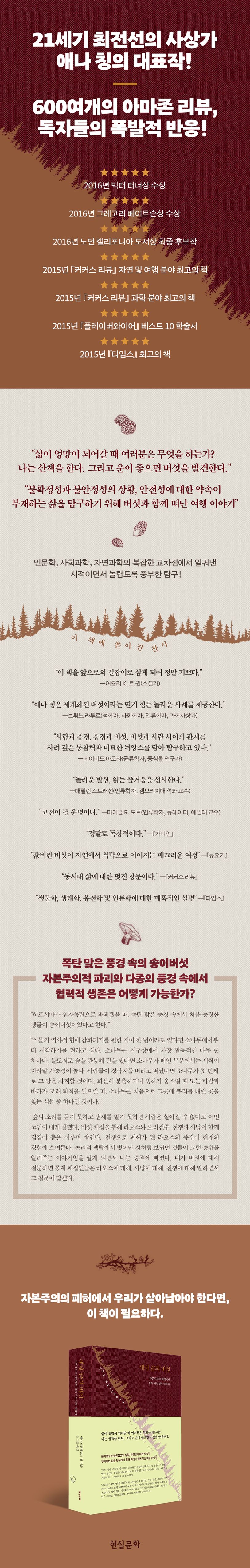 “우리가‘자본주의의폐허’에서살아남아야한다면,경제,문화,생물학,생존전략사이에전혀예상하지못한연결이어떻게가능한지에대한사례가필요하다.애나칭은세계화된버섯이라는믿기힘든놀라운사례를제공한다.”―브뤼노라투르(철학자,사회학자,인류학자,과학사상가)