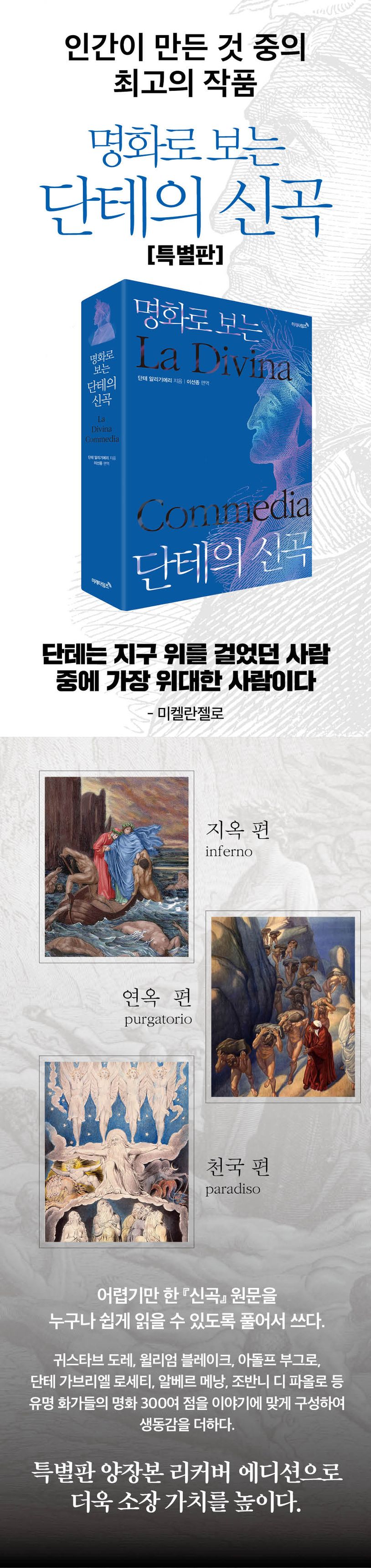 『신곡』은 지옥, 연옥, 천국을 여행하는 형식으로 인간의 욕망과 죄악, 운명과 영혼의 구원을 심오하게 그려낸 대서사시이다. 아홉 개의 구역으로 분류된 지옥은 영원한 슬픔과 괴로움의 세계를 나타내고, 일곱 개의 구역으로 구성된 연옥은 구원받은 영혼이 천국에 들어가기 전에 그 죄를 깨끗이 씻어내는 곳이다. 그리고 열 개의 구역으로 되어 있는 천국은 인간들이 하느님에게로 이르는 길을 제시하고 있으며 그 결말은 기쁨으로 끝이 난다.