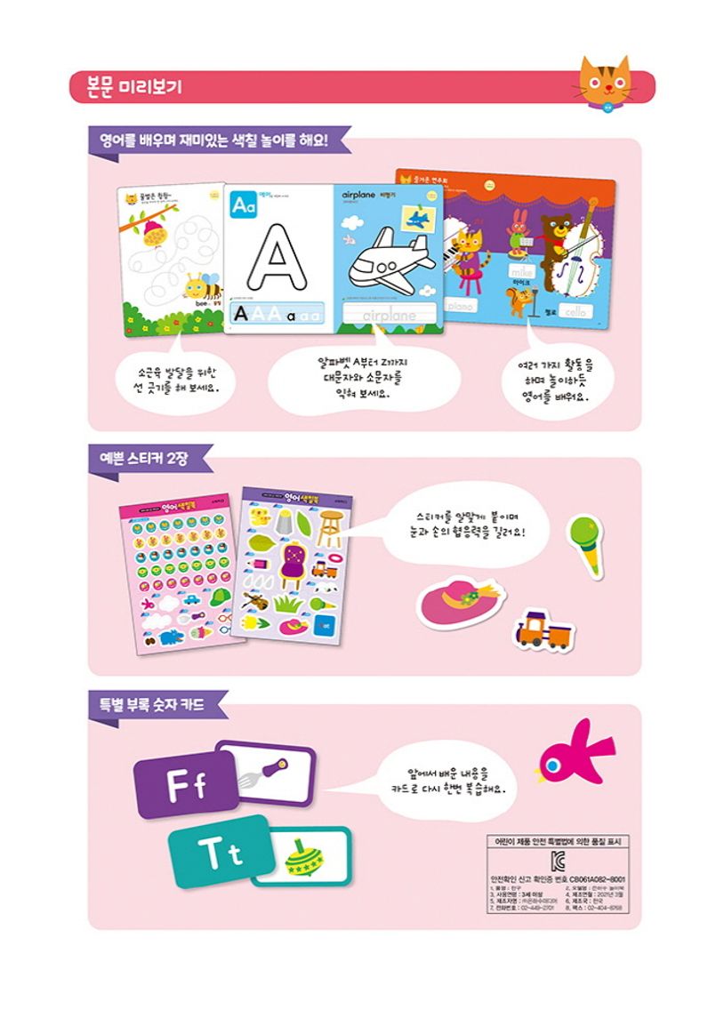 「엄마와 함께 쉽고 재미있게! 색칠북」 시리즈는 아이들이 좋아하는 놀이인 스티커를 붙이고 색칠하는 활동을 통해 즐겁게 학습할 수 있도록 구성했어요. 스티커를 알맞게 붙이며 소근육을 발달시키고 집중력도 기를 수 있지요. 특별 부록으로 실린 학습 카드를 언제 어디서나 가지고 다니며 앞에서 배운 내용을 다시 한번 복습할 수 있답니다.