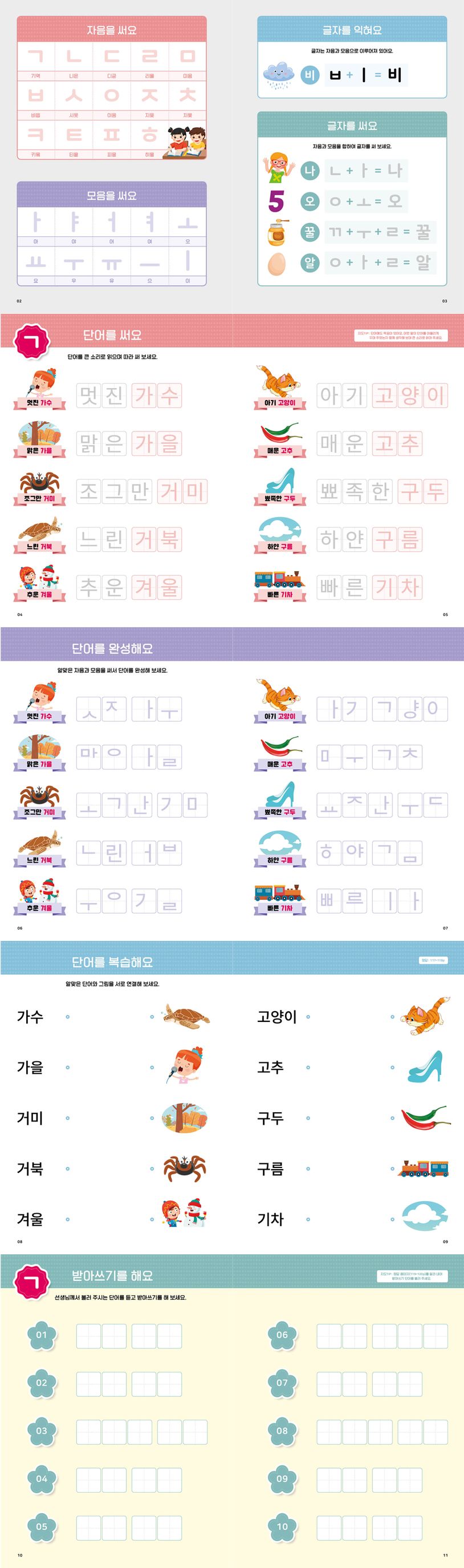 단어에 어떤 자음과 모음이 빠져 있는지 파악하고 직접 단어를 완성해 보며 글자를 외웁니다.
