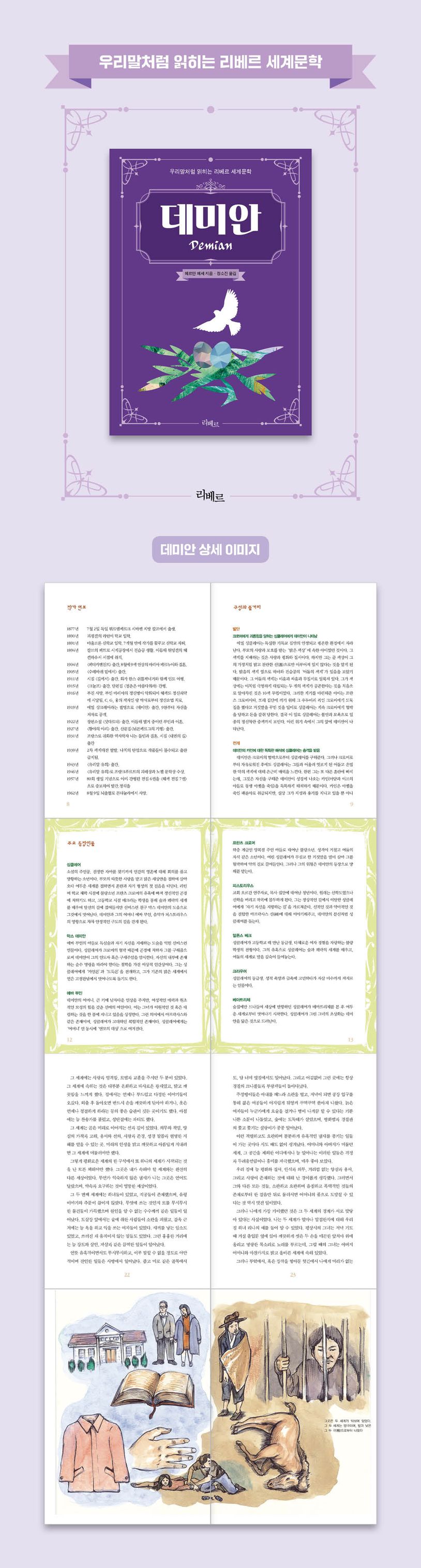 데미안을 통해 내면적으로 성숙해가는 싱클레어에 관한 성장 소설. 철학적 페이소스를 담고 있는 아름답고 유려한 문장, 고개를 끄덕이게 하는 삶의 비유는 때로 페이지를 넘기기조차 힘들게 한다. 감수성이 풍부하고 여린 싱클레어가 소년기와 청년기를 거쳐 어른으로 성장하는 과정이 한 폭의 수채화처럼 아름답게 그려져 있다. 선과 악, 밝음과 어둠을 동시에 품은 신 아프락사스는 데미안의 의식 세계를 형성하고 있을 뿐 아니라 전 세계 독자들의 의식 세계에도 정신적 충격을 주었다.