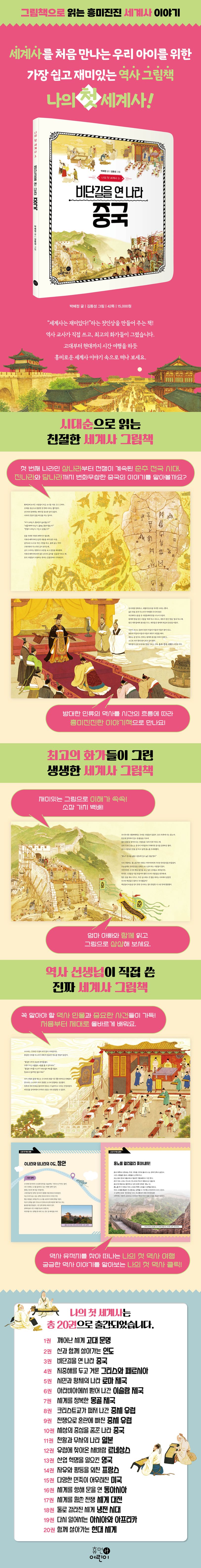 〈나의 첫 세계사〉는 세계사를 처음 접하는 아이들을 위한 그림책 시리즈입니다. 최초의 문명이 발생한 고대부터 전 세계가 하나로 연결된 현대까지 시대별 세계사를 다루며 총 20권으로 출간됩니다. 방대한 인류의 역사를 시간의 흐름에 따라 흥미진진한 이야기로 풀어내며 인도, 중국, 일본, 미국 등 하나의 나라를 집중적으로 탐구하거나 르네상스, 산업 혁명, 세계 대전 등 중요한 역사적 사건을 주제로 삼아 다양한 시각으로 세계사를 공부할 수 있습니다. 권마다 최고의 화가들이 뛰어난 표현력으로 그려 낸 세계사 속 장면들은 아이들의 호기심을 불러일으키고 생생한 몰입감을 선사합니다. 세계사의 커다란 흐름을 파악할 수 있도록 꼭 필요한 핵심만을 가려 뽑은 친절한 역사책으로, 앞으로 배우게 될 수많은 지식의 토대를 쌓을 수 있는 든든한 세계사 기본서입니다.