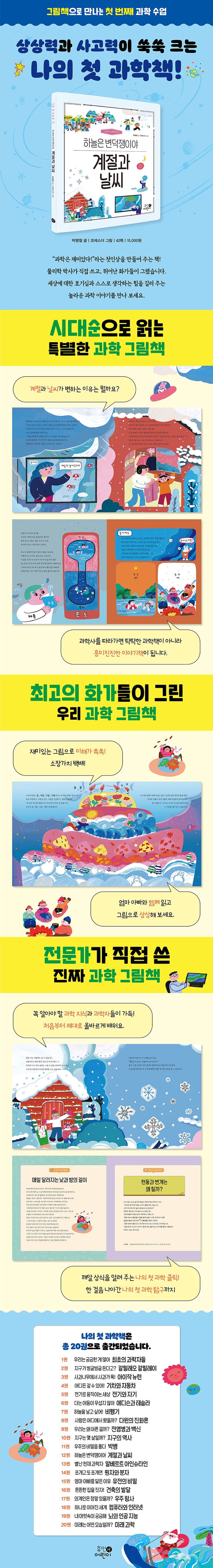 나의 첫 과학책 12권은 사계절이 존재하는 이유부터 구름, 비, 눈, 바람, 태풍이 발생하는 원리, 일기 예보의 비밀까지 《계절과 날씨》의 모든 것을 흥미진진하게 밝혀 줍니다.