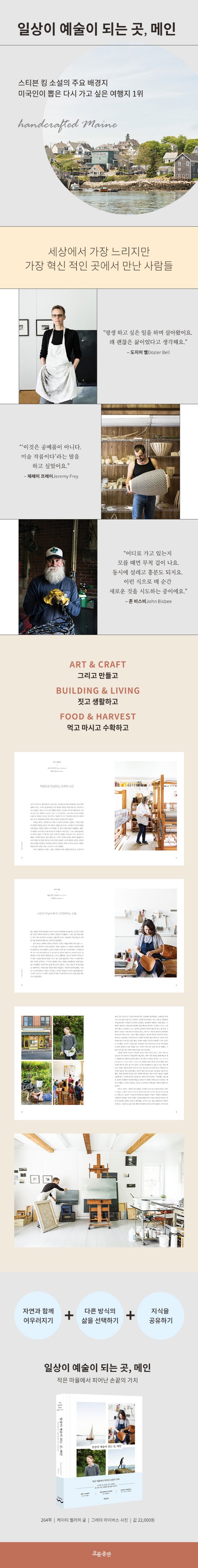 선택. 자연. 혁신. 세 가지 단어가 어떻게 화합될 수 있을지를 보여주는 책 〈일상이 예술이 되는 곳, 메인〉. 이 책은 ‘매일 하고 싶은 일을 하며 잘살 수 있을까?’에 대한 질문에 현실적인 해답을 내놓는다. 아름다운 자연에 영감을 얻어 그림을 그리는 도지어 벨, 인디언들의 전통적인 방식으로 바구니를 짜는 제레미 프레이, 직접 수확한 식재료만으로 요리를 하는 레스토랑을 차린 체이스 가족, 세상에서 단 하나뿐인 도자기를 만드는 아유미 호리에……. 이들은 모두 자신만의 삶의 방식으로 세상을 헤쳐 나가며 충만감 있는 일상을 영위하고 있다. 어떻게 자본의 굴레에서 벗어나 나만의 독특한 브랜드를 만들고 즐기며 살 수 있을까? 메인주에는 어떤 비밀이 숨겨져 있길래 이런 삶이 가능한 걸까? 숭고하도록 아름다운 메인주의 대자연 속에서 손끝으로 가치를 만들어내는 사람들의 이야기를 유려한 글과 생생한 사진으로 담았다.