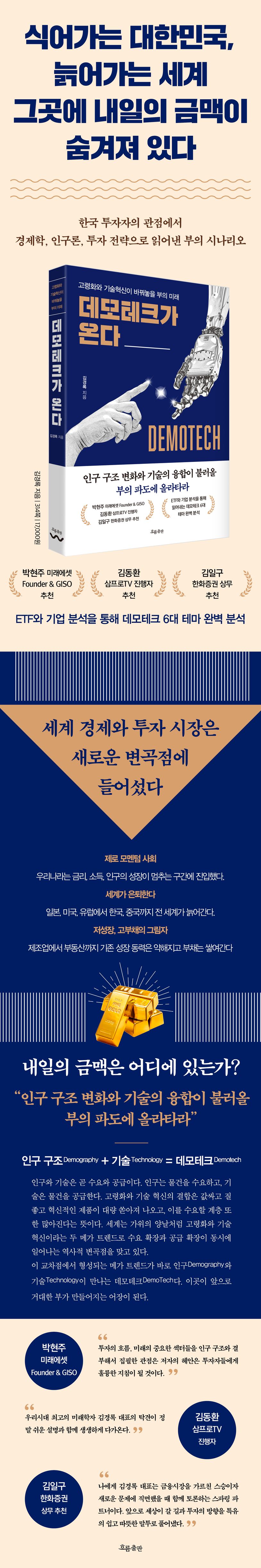 김경록 미래에셋투자와연금센터 대표가 경제학, 인구론, 투자 전략을 통해 우리나라와 세계 경제의 흐름을 짚어보고 앞으로 투자 시장의 핵심 테마로 떠오를 메가 트렌드 데모테크(Demotech)를 소개한 책.