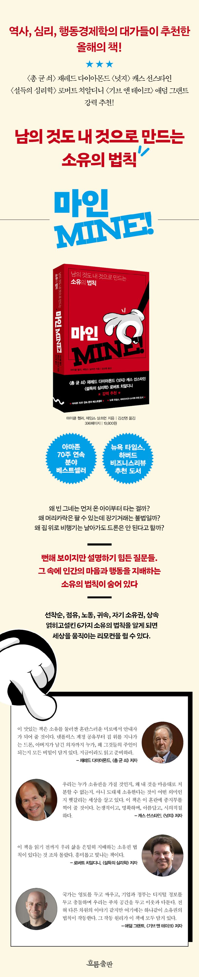 그런데 《마인》은 저자이자 소유권에 대한 세계 최고의 권위자인 마이클 헬러 컬럼비아대학교 교수와 제임스 살츠먼 캘리포니아주립대학교 교수는 소유권처럼 잘못 알려진 것도 없으며 소유권 원칙이 ‘실제로’ 어떻게 작동하는지 알고 나면 여러 사건의 이면에 숨겨진 진실에 눈 뜰 수 있다고 말한다. 《마인》은 출간 이후 지금까지 아마존 70주 이상 분야 베스트셀러에 올라으며 〈총 균 쇠〉의 재레드 다이아몬드, 〈넛지〉의 캐스 선스타인, 〈설득의 심리학〉의 로버트 치알디니가 올해 꼭 읽어야 할 작품으로 손꼽은 책이다.