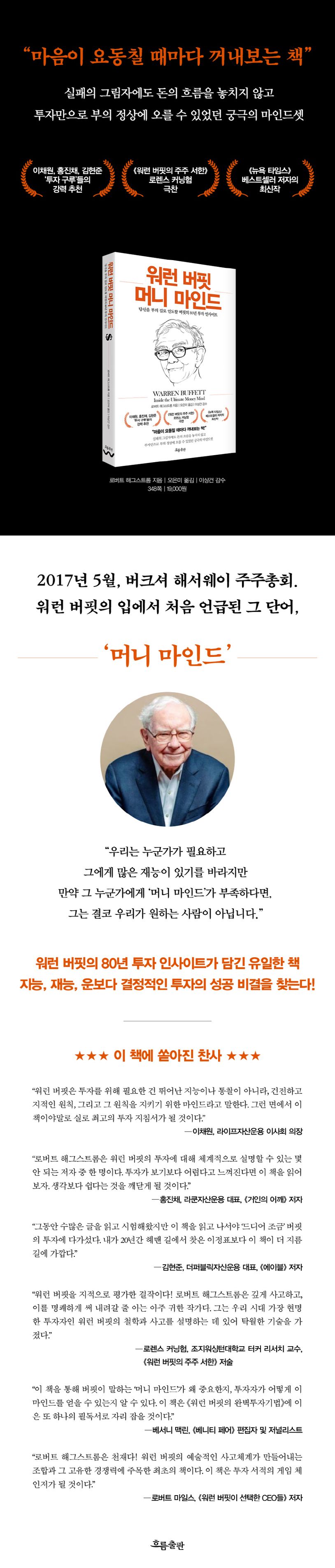 《워런 버핏 머니 마인드》는 성공 투자를 위한 버핏의 투자 원칙과 그 원칙을 지켜나갈 마음가짐을 모두 한 권에 담은 책이다. 그동안 출간된 워런 버핏 관련 서적들이 ‘버핏은 무엇을 하는가?’에 초점을 맞추고 있었다면 이 책은 ‘버핏은 어떻게 생각하는가?’를 알리는 데에 중점을 두었다. 투자에 성공한 사람들을 보며 흔히들 생각하곤 한다. ‘머리가 좋은가?’ ‘운이 따라줬겠지.’ 하지만 워런 버핏은 말한다. 성공 투자에 필요한 것은 지능보다, 재능보다, 운보다 바로 ‘머니 마인드’라고 말이다. 버핏이 가진 궁극의 머니 마인드를 살펴본다면 최소한 소란스러운 투자 시장에 끌려다니지 않고 그 끝에 미소를 지을 수 있을 것이다.