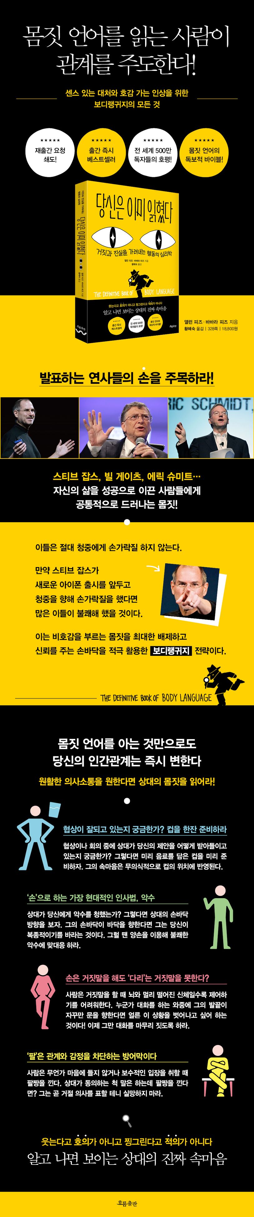 커뮤니케이션 분야의 권위자이자 인간 행동 전문가 저자들의 30년 연구가 집대성된 《당신은 이미 읽혔다》는 2012년 출간 즉시 베스트셀러, 몸짓 언어의 독보적 바이블으로 자리 잡았다. 보디랭귀지는 누군가를 설득하고 자신의 의견을 효과적으로 피력할 때 굉장히 유용한 수단이다. 업무적인 미팅이 잦은 사람, 발표나 강연을 하는 사람, 그 외에도 자신을 둘러싼 인간관계를 조금 더 긍정적으로 바꾸고 싶다면 이 책을 한번 읽어보기를 권한다. 일상에서 쉽게 접하는 상대의 몸짓을 해석하고 내가 무심코 행하던 부정적 몸짓을 제어하기 쉬울 것이다. 몸짓, 얼굴, 표정 등을 활용하여 상대에게 원하는 것을 얻고, 상대가 원하는 것을 주는 원활한 의사소통의 기술을 소개한다.
