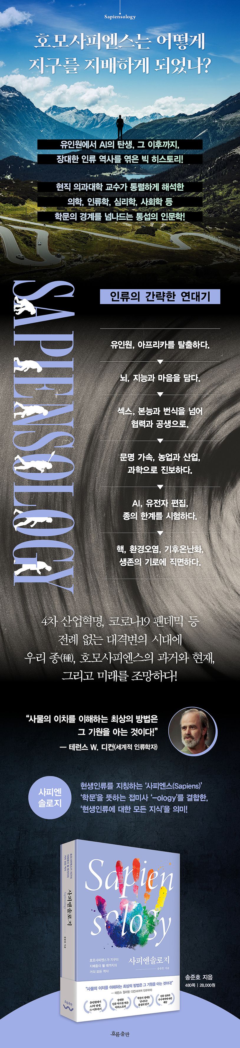 이 책 《사피엔솔로지》는 의과대학 교수이자 내과의사로서 의료 현장에서 산학연 융합 연구 등을 통해 꾸준히 학문적 통섭을 시도해 온 저자가 의학은 물론이고, 인류학, 심리학, 사회학 등 다양한 학문을 넘나들며 호모사피엔스의 과거와 현재, 그리고 미래를 입체적으로 정리해낸 인문 교양서다. 책의 제목인 ‘사피엔솔로지’는 현생인류를 지칭하는 ‘사피엔스(Sapiens)’와 ‘학문’을 뜻하는 접미사 ‘-ology’를 결합해 창안해낸 용어로, ‘현생인류에 대한 학문’을 가리킨다. 즉, 《사피엔솔로지》는 아프리카 대륙에서 발원한 한 줌의 작은 집단이 오늘날 전 지구적인 영향력을 가진 존재로 부상하게 된 역사적 과정을 통섭적인 관점에서 서술한 빅 히스토리다.